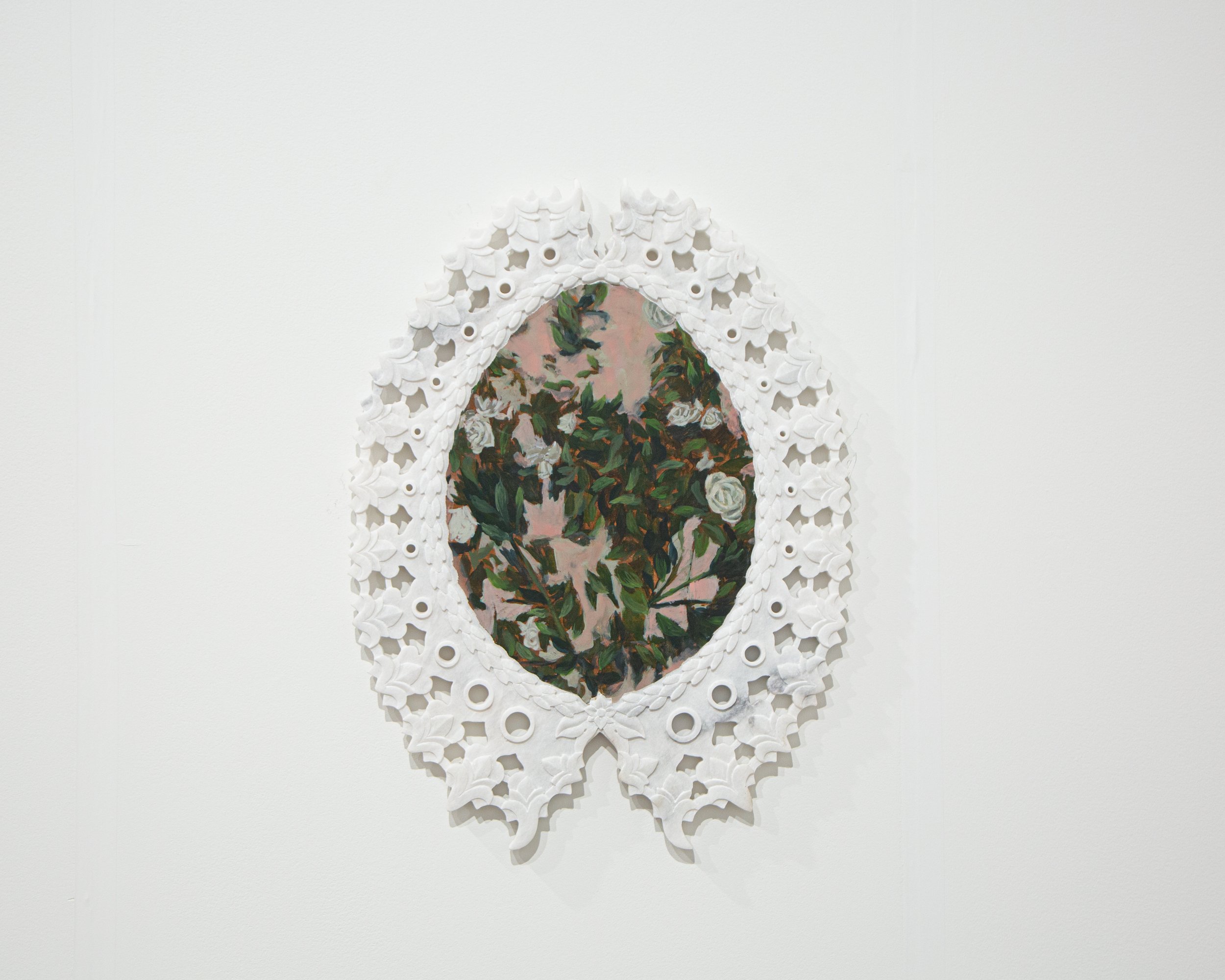 Oil paintings framed by extensively carved white marble, appropriate motifs from lace-edged traditional clothing from South Asia to explore ideas of femininity, oppressive gendered expectations and the search for personal joy. Flora and fauna motifs in metal, marble and clay are juxtaposed with scenes of the domestic and the urban, creating a surreal terrain. Agha works extensively with pink marble, which is solid and imposing, yet pliable in texture. Its unique, mottled, bodily hues and patterns are reminiscent of skin and veins. She also utilises the material’s historical links to monuments, mausoleums and homes in South Asia, where its presence has become synonymous with monumentality, permanence and grandeur.